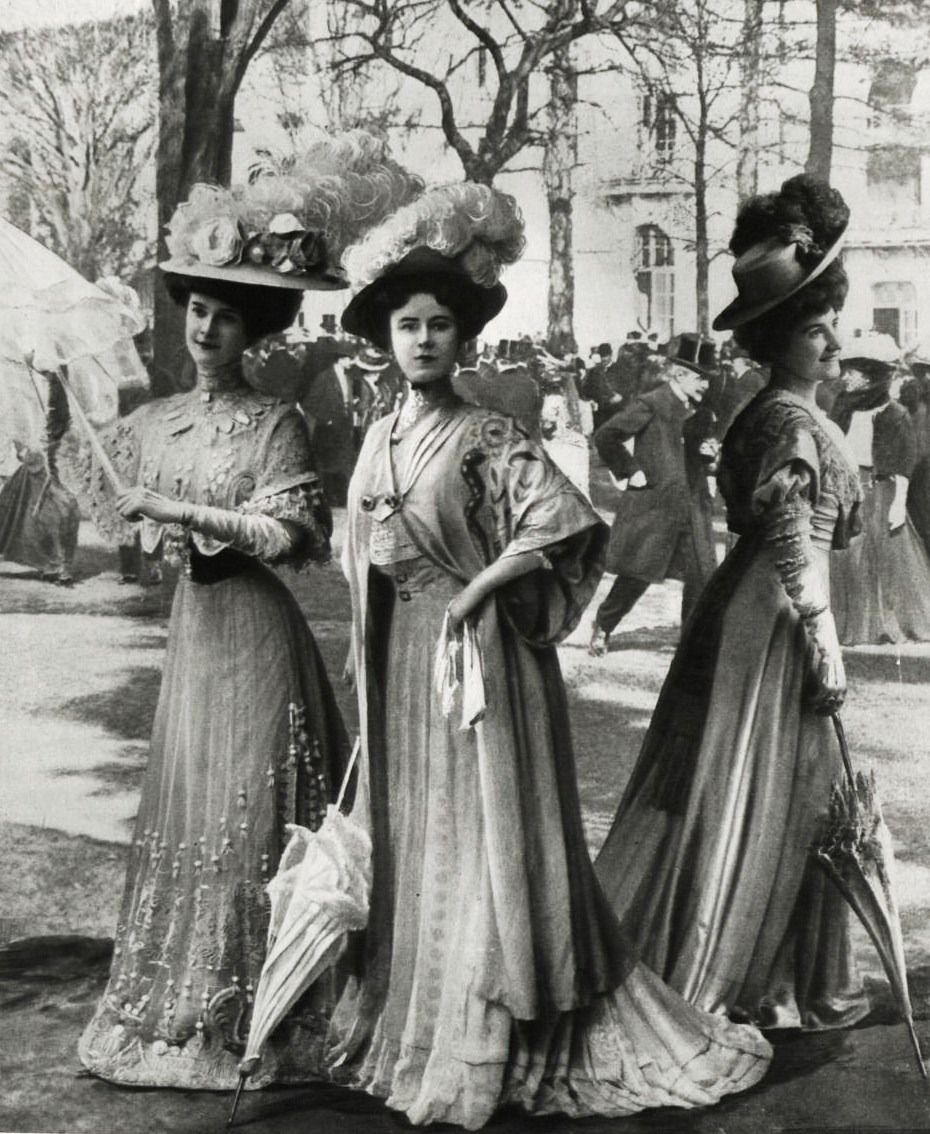 During Gibson girl era (1890s through 1905), also known as Edwardian era, two piece skirt and blouse started to emerge with style. Gibson girl look consisted of tops and blouses with extra wide puffed sleeves and shoulders which was paired with curved corseted waist and a-line long length skirts. Gibson hair were voluminous topped with a large flower and feather in the hats.